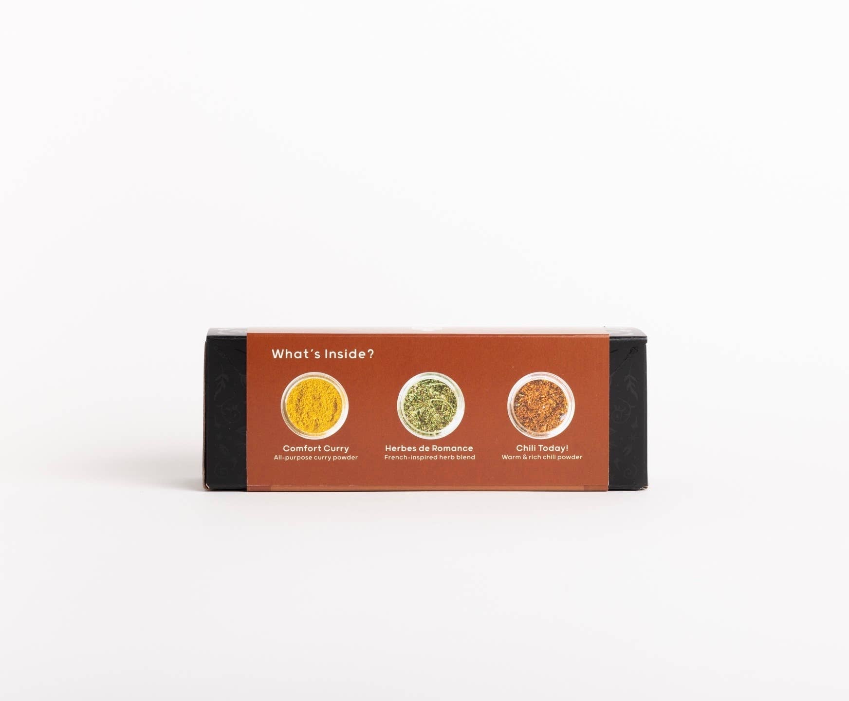 3 jar gift set! Three of classic blends in a gift box with a QR code recipe card. Includes top selling Classic blends Herbes de Romance, Chili Today!, and Comfort Curry. Herbes de Romance- Our version of Herbes de Provence includes local Massachusetts rosemary, lemon verbena, and wild Maine oregano (among other things!). Great with eggs, poultry, vegetables, or anywhere you need a delicious herbal touch. Chili Today! - Chili powder is an American classic, coming in many styles. Ours is warm and rich, with mild heat and deep flavor. Perfect for bean chili, hash browns, spiced nuts or as a rub for meat. Turkish urfa chile adds a chocolatey, fruity note complimented by Cambodian long pepper (a relative of black pepper). Toasted cumin, ancho chile and Mexican oregano round out the party. Comfort Curry - Inspired by South Indian style curries, this deeply aromatic yellow curry spice mix is blended from our gorgeous Indian turmeric along with mace, nigella and white pepper. A mild, warming curry
