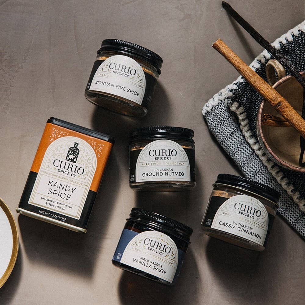 Elevate your baking game and perfume your kitchen with these aromatic spices chosen for experts and beginners alike! Includes baking essentials like nutmeg and ginger, as well as two of Curio's Signature Blends. Try making our Kandy Spiced Pumpkin Cookies, or use Fleur Spice to add beautiful color to shortbread. And, if you haven't tried it, there's nothing like freshly grated nutmeg for apple or pumpkin pie!
