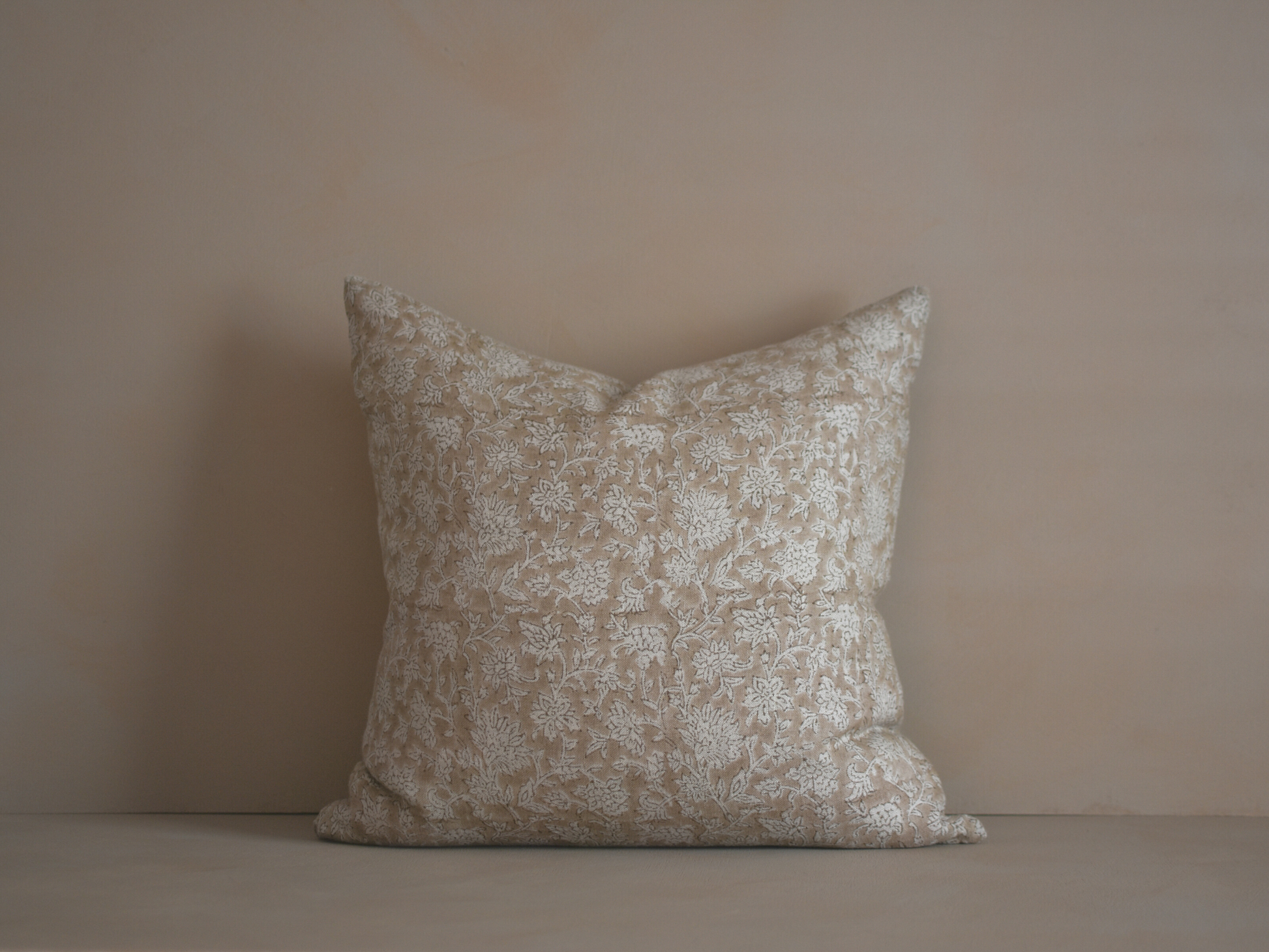 Light brown floral pattern hand block printed on a natural linen fabric Some variation with vintage fabrics and small imperfections that comes with handmade goods is considered acceptable