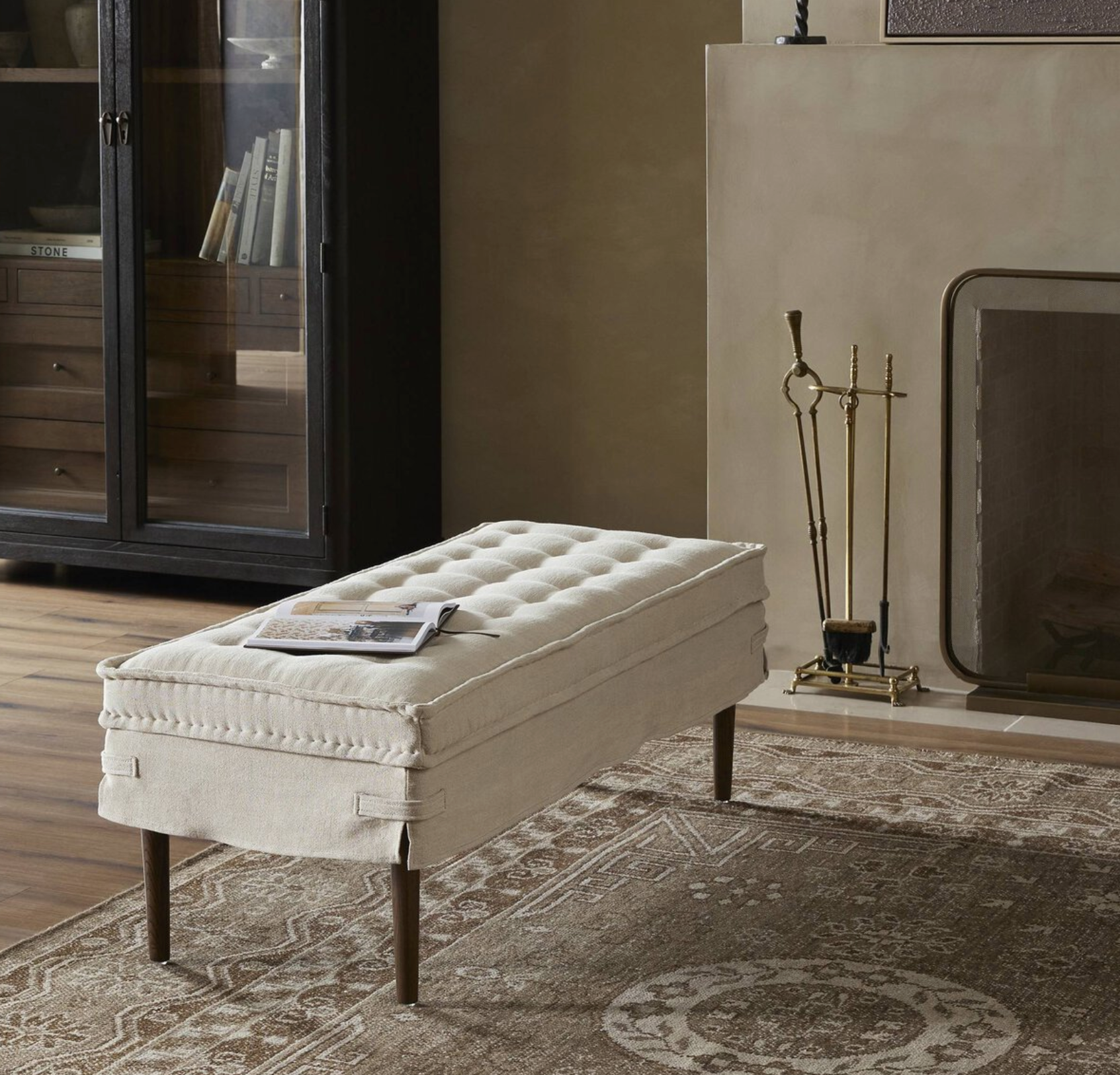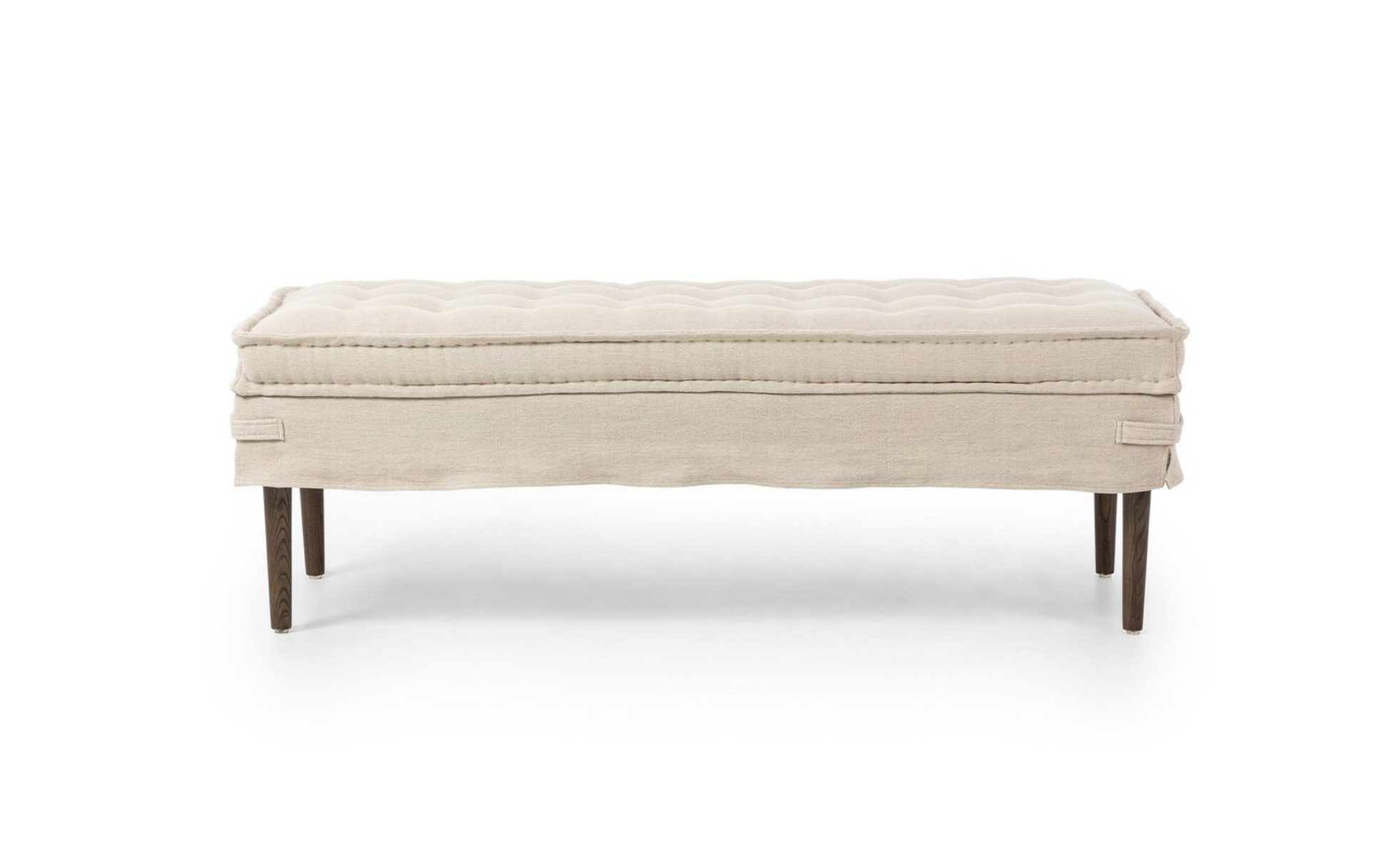 A French mattress-style cuxhion with X hand-stitching and blind tufts sits on tapered, dark brown oak legs. This piece is completed with a kick pleat and corner straps, all in a natural, linen-like fabric.