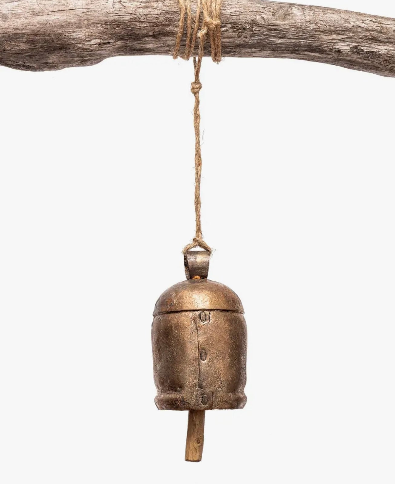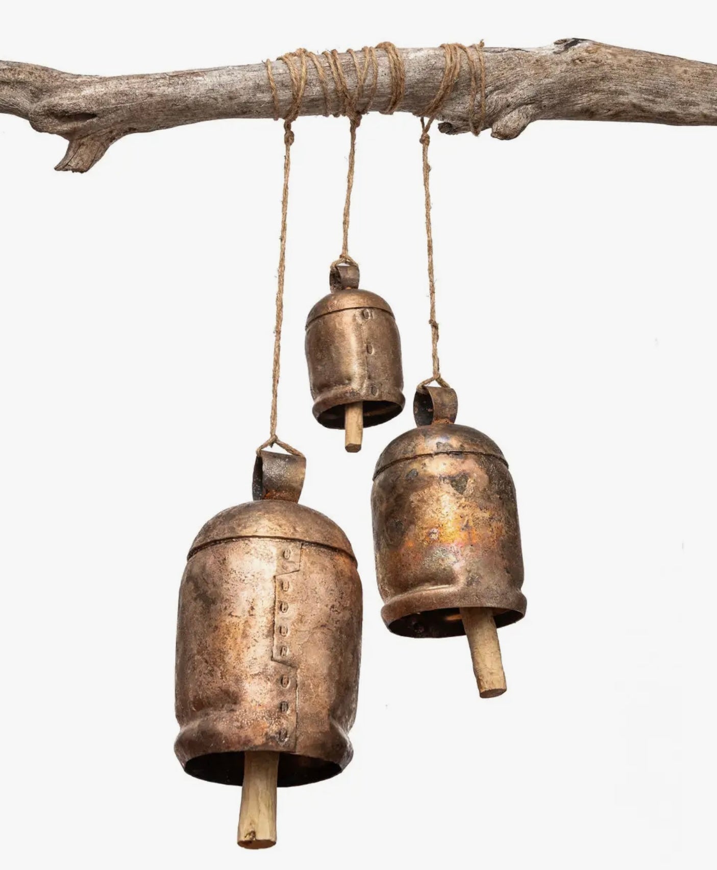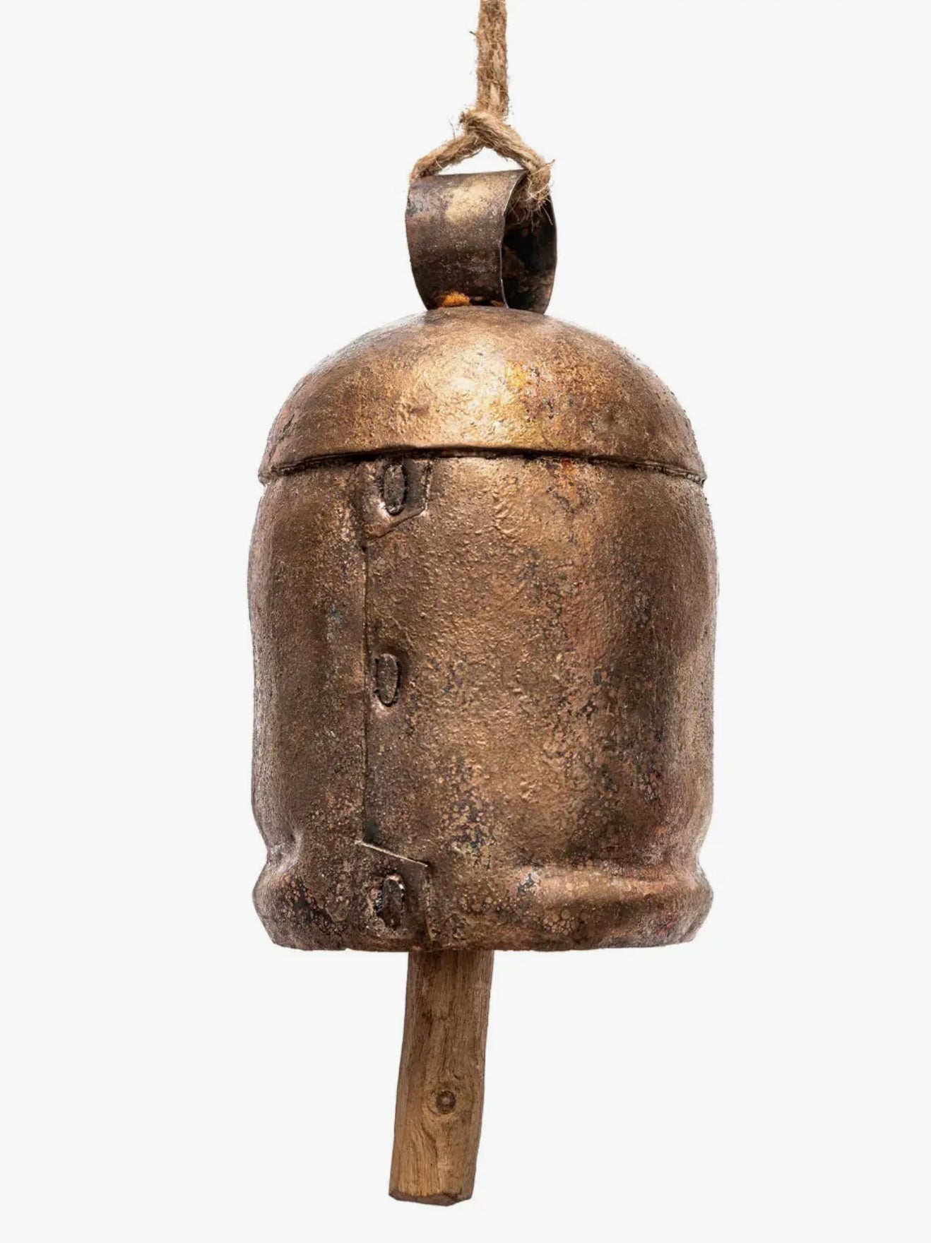 The bells are formed from sheets of recycled steel. They are beaten into shape by hand, then dipped in copper. Women make a dough that they pat around the bells, the bells are then buried under the hot desert sand in a kiln. The heat anneals the metals, welding them into bronze, giving each piece its unique patina. After firing, each bell is individually hand-tuned by Janmamad Luhar. This is what truly makes each of these pieces unique!