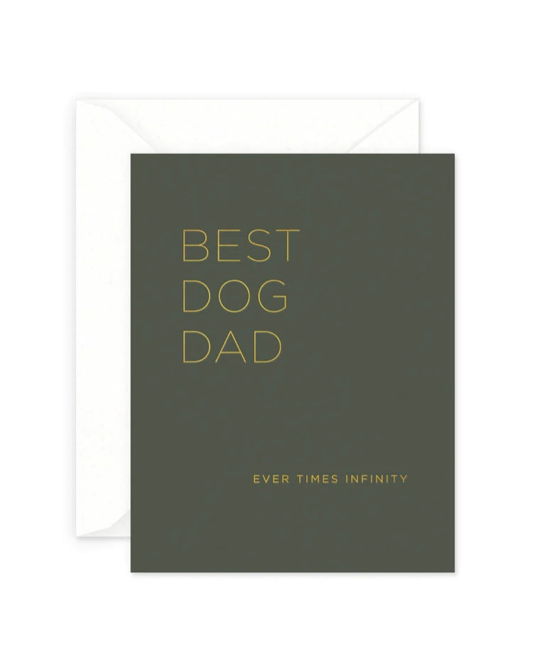 Dog Dad Card is printed with foil stamping on luxe heavyweight textured cardstock. Gold foil on dark green paper for the best dog dad, ever times infinity.