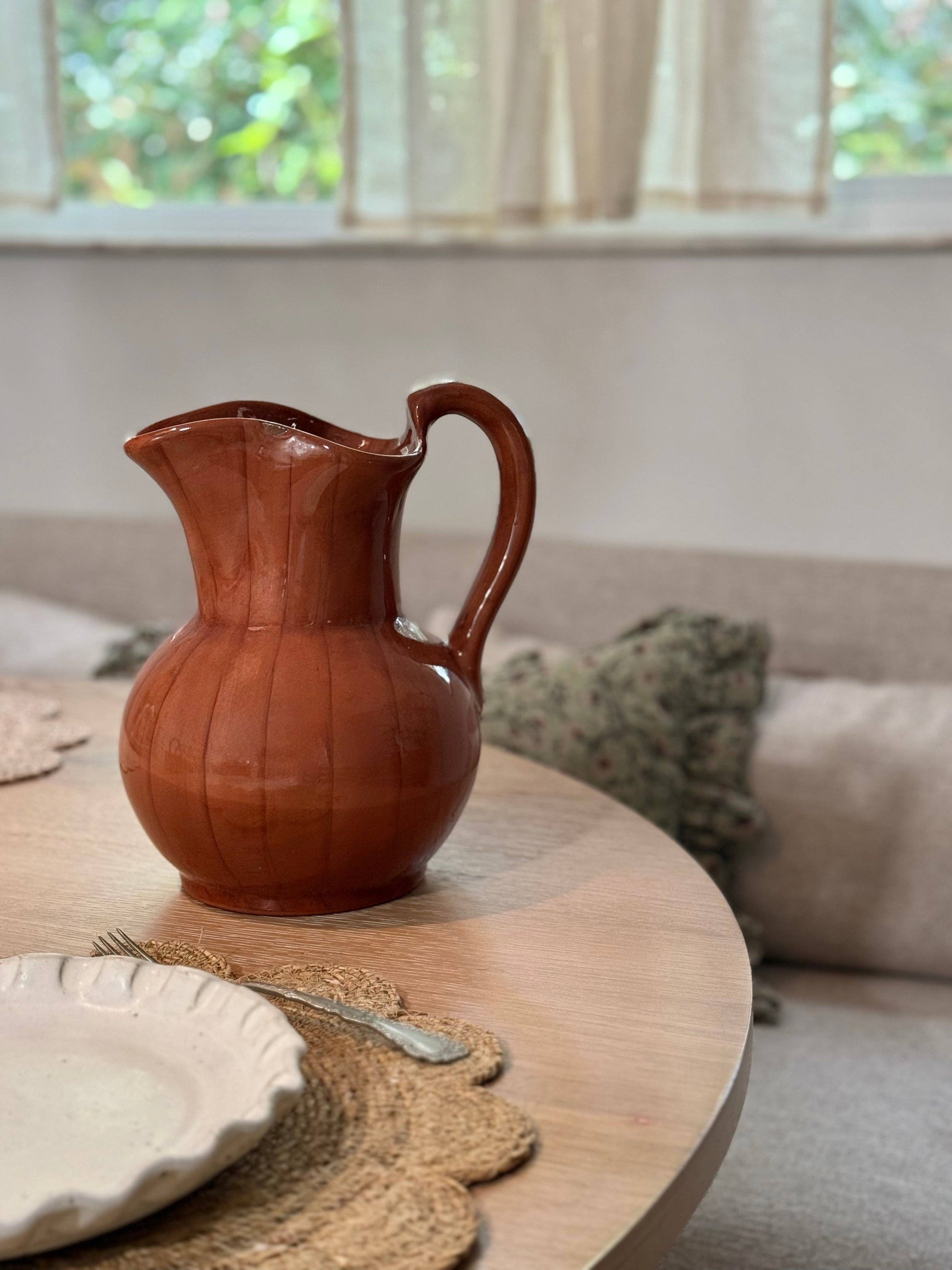 Handcrafted from clay by artisans in Mexico, the Glazed Terracotta Pitcher brings a touch of old-world charm to any setting. Fill it with flowers, water or sangria for a timeless, warm, and inviting tablescape. KINDLY NOTE: Due to the traditional manufacturing process and the handmade nature of this item, there will be some chipping on the paint or imperfections. This is a natural characteristic of handcrafted pottery and adds to the authenticity and charm of the product. - Approximate Size: 7”W x 10"H