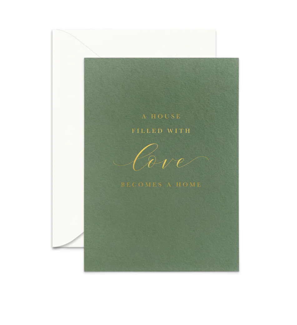 OUR HOUSE OF LOVE CARD IS FOIL STAMPED ON LUXE HEAVYWEIGHT TEXTURED CARDSTOCK. GOLD FOIL ON GREEN PAPER