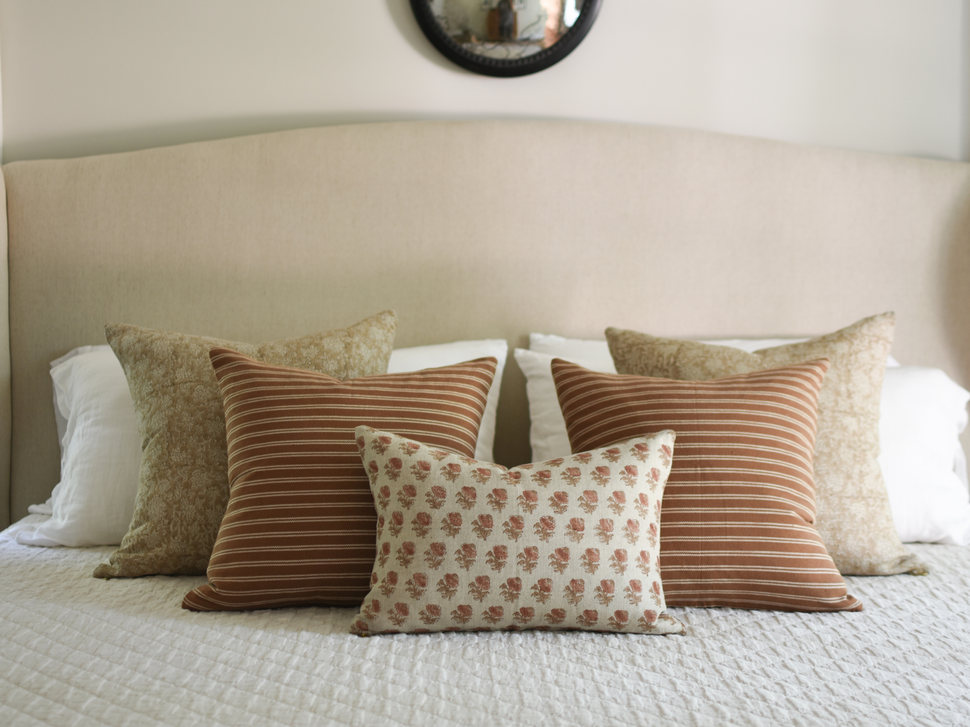 Pillow cover made from 100% linen block printed fabric imported from India. Pillow cover has - - An exposed brass zipper - Pillow has the same pattern on front and back. Sand colored natural linen base with terracotta and medium brown hand block printed florals. Some variation with vintage fabrics and small imperfections that comes with handmade goods is considered acceptable