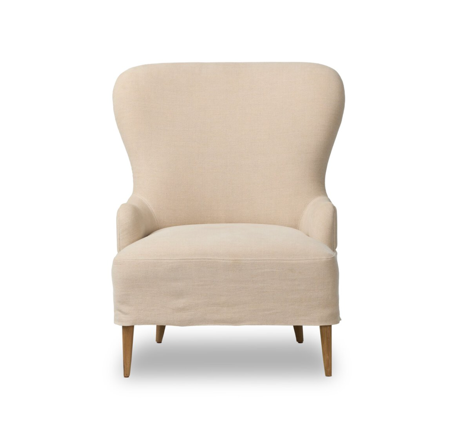 The classic wingback gets a fresh reboot. Upholstered in a flax/linen blend, with a skirted seat for a casual look and foam seating plus S-spring suspension for comfort. Framed out by aged smoked oak. A design collaboration by Amber Lewis and Four Hands.