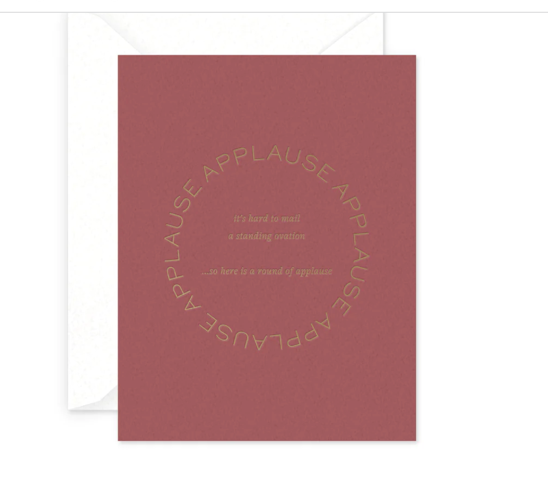 OUR ROUND OF APPLAUSE GREETING CARD IS PRINTED WITH FOIL STAMPING ON LUXE HEAVYWEIGHT CARDSTOCK. GOLD FOIL ON DEEP ROSE PAPER.