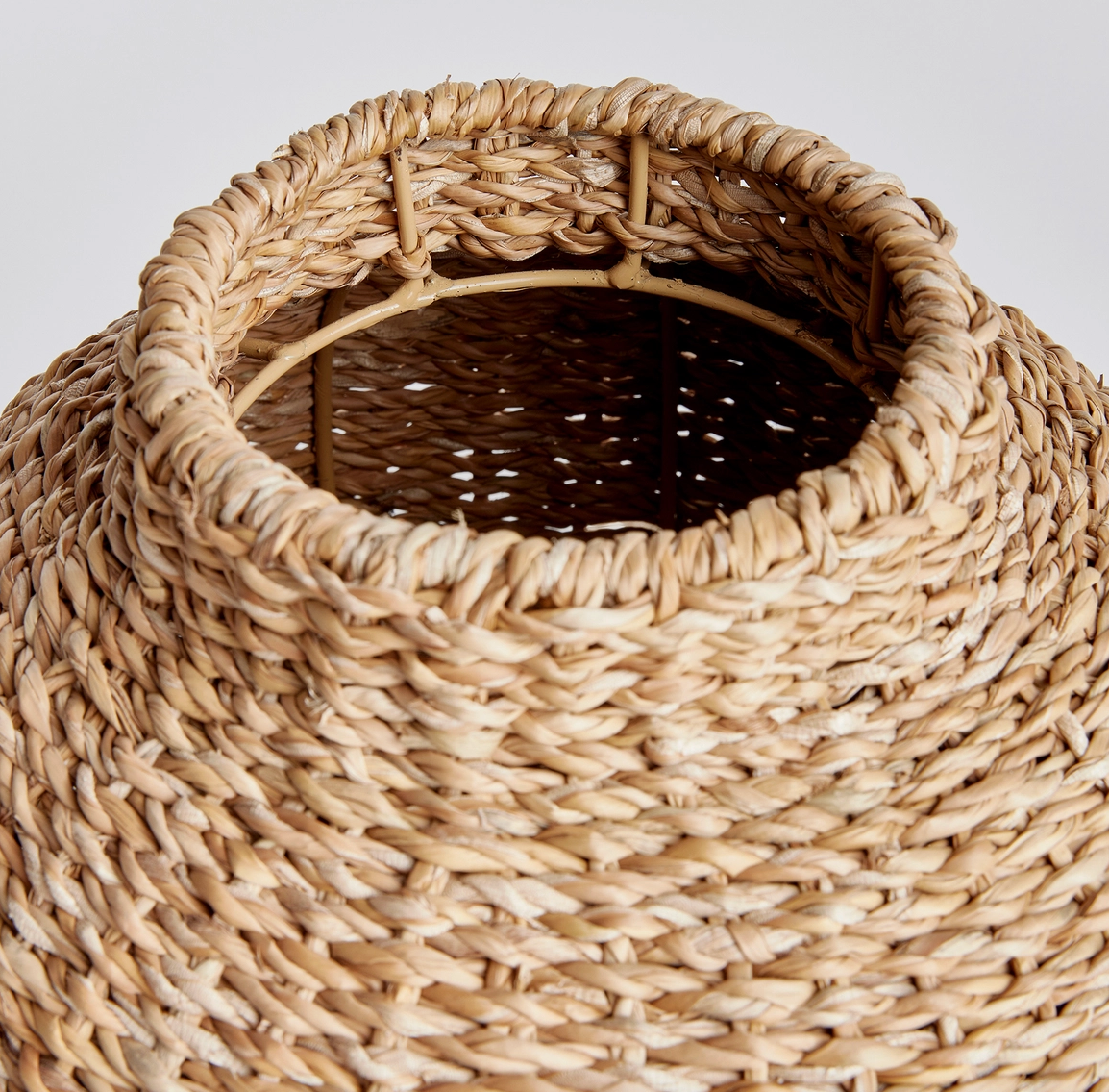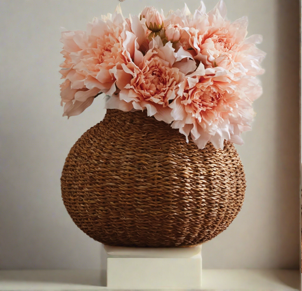Seagrass is naturally supple, not stiff. Beautiful in color as well as texture. This round vase is solidly constructed with an iron frame to keep it's shape. A nice complement to a tall faux stem.
