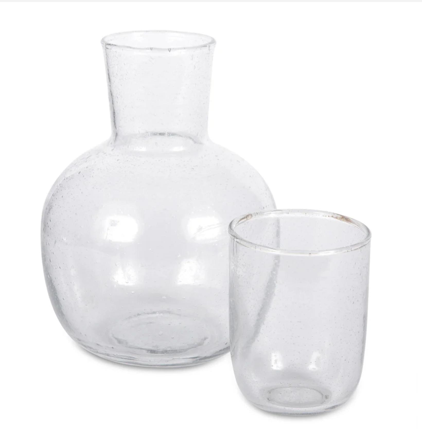 This hand-blown carafe and drinking glass set strikes the delicate balance between elegance and rusticity, with an organic shape and subtle, effervescent bubbles.