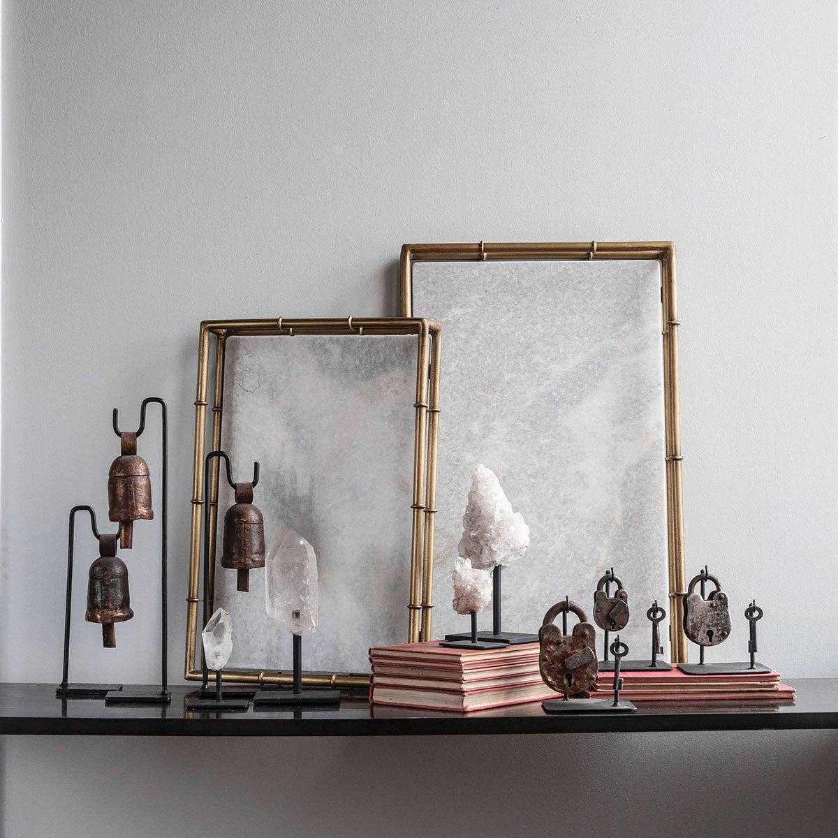 The sound of meditation and arrivals, bells fill the air with resonating vibrations. The Decorative Bells set of three showcases three vintage metal bells in assorted sizes and styles on welded metal hooks for artistic display.