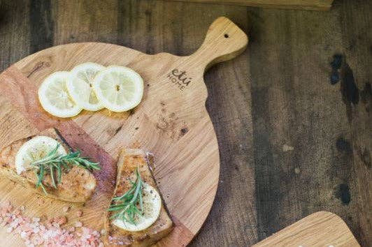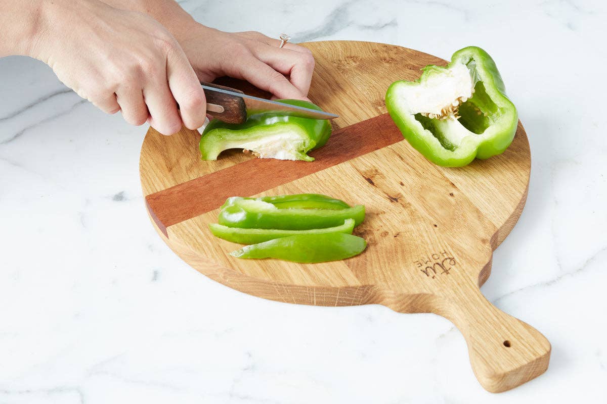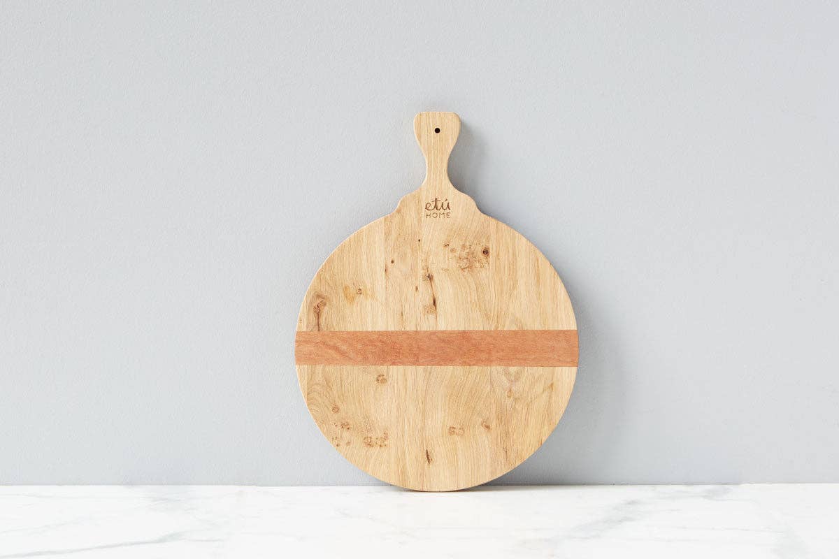 Prep, chop, and serve...The Spanish Chopping Board is the perfect size for bustling around the kitchen. Handcrafted from oak hardwood and featuring a unique handle, it is both lightweight and ideal for cutting and serving. Distinguished by a slat of mahogany timber to prevent warping of the reclaimed wood, these everyday boards will last a lifetime.