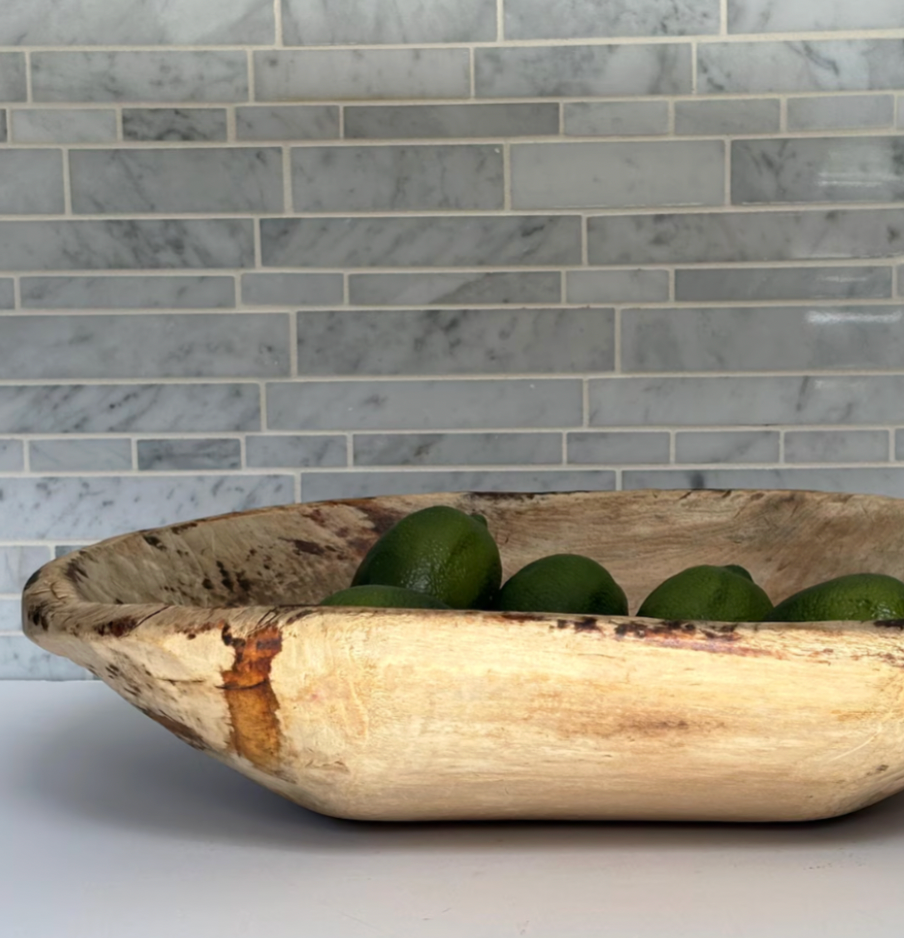 Sourced in a brocante in the south of France, this piece was a daily staple in farmhouses for morning bread making. These hand-hewed bowls date back to the 1900s. Shapely oval bowl with gorgeous antique patina. A great addition to kitchen or bathroom or displayed in a stack! Each dough bowl is unique and will vary with patina. Dimensions: 16.5" L x 10" W x 4" W In good vintage condition, as founded, with wear commensurate with age & use. Great patina.