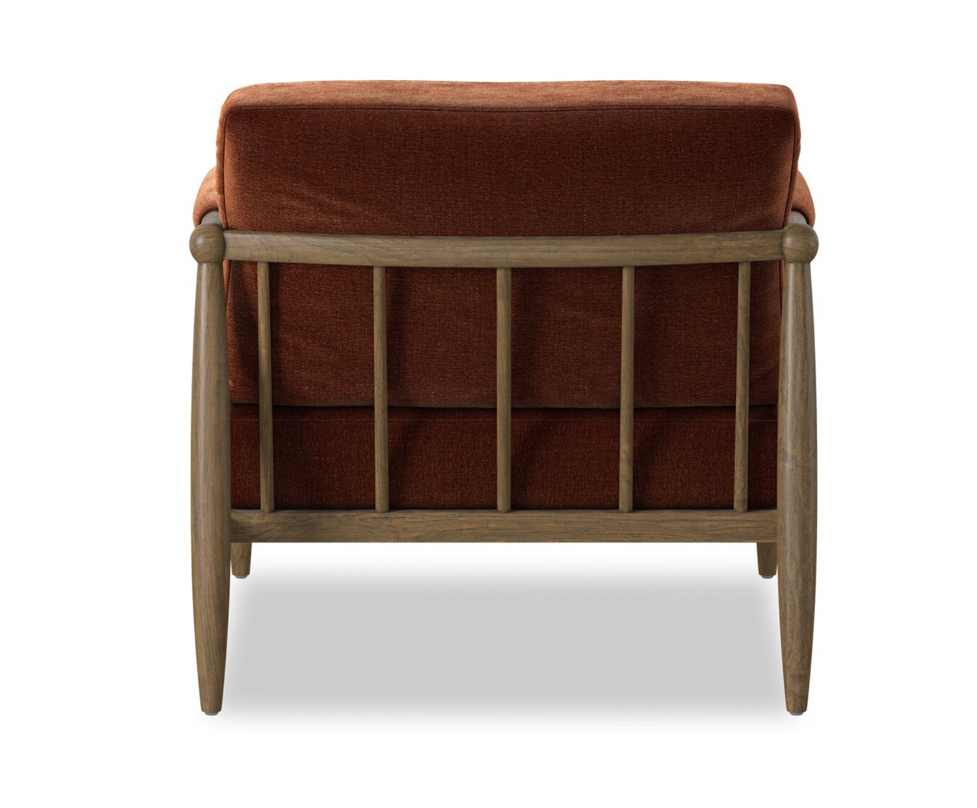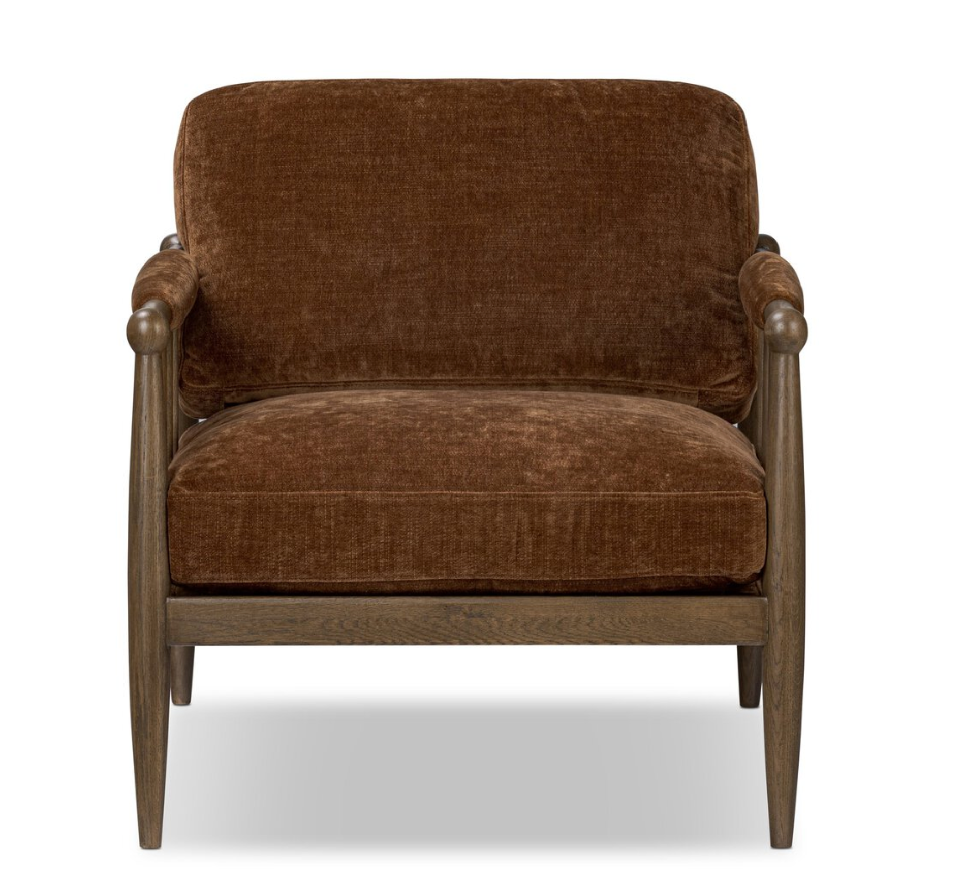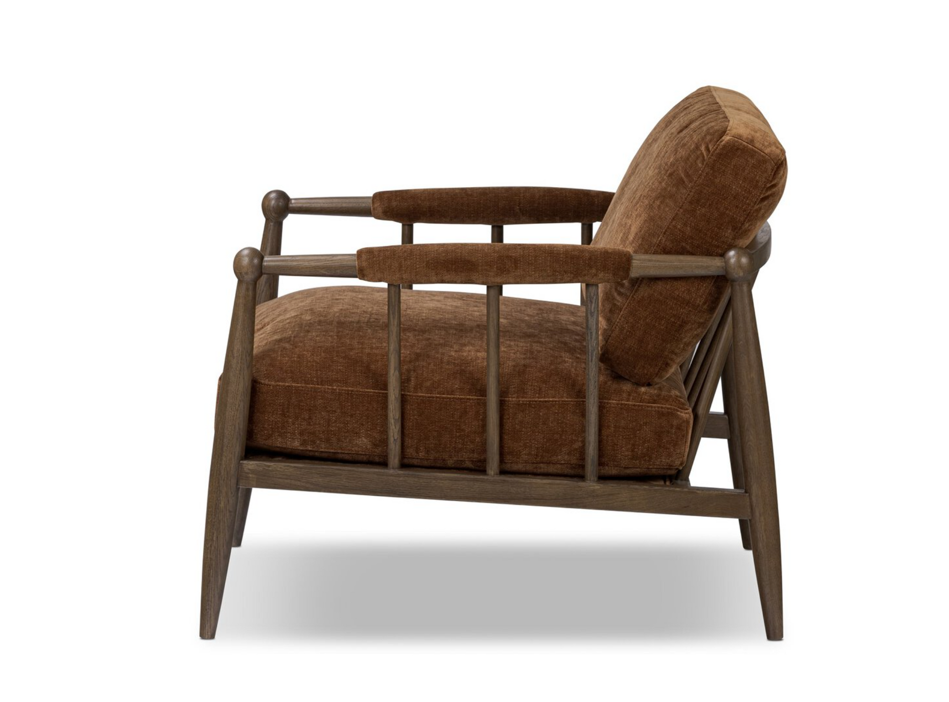 Vintage oak framing features meticulous details, with tapered legs and seamlessly integrated arm wraps. Spindles beneath the arms rise to form a fluid connection with the frame, enhancing the chair's airy silhouette. A chenille-like velvet offers comfort with track-resistant livability. A design collaboration by Amber Lewis and Four Hands.